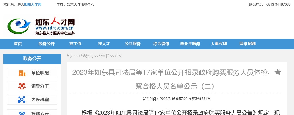 【2023南通市如东县司法局等17家单位招录政府购买服务人员体检、考察合格人员公告(二) 进入阅读模式】相关岗位: